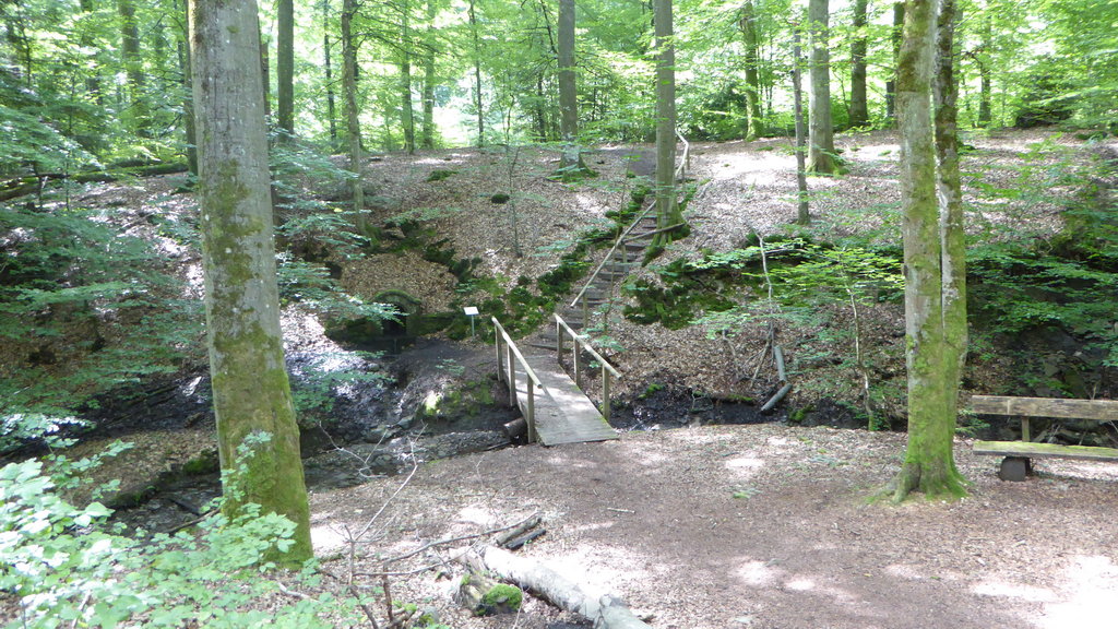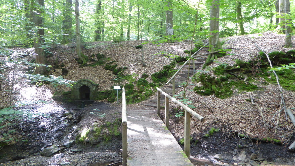 Die Fahrt ging über Grafenrheinfeld, Grettstadt, Hundelshausen in den Steigerwald. Bei einer früheren Pause sah ich an einem Parkplatz den Hinweis "Wotansborn". Diesen besuchte ich diesmal. 280 m Fußweg in den Wald und die 1912 gefaßte Quelle war erreicht.