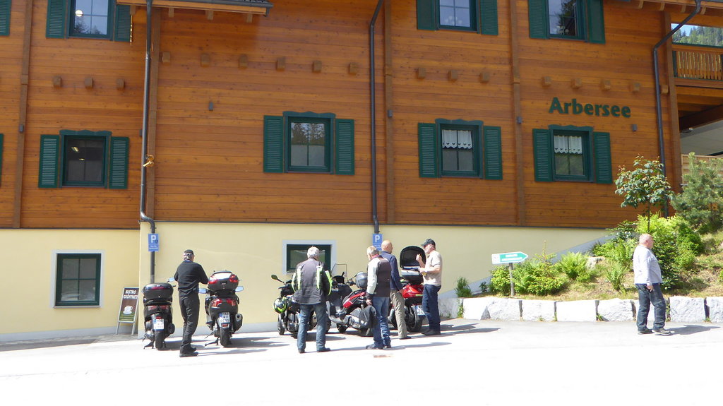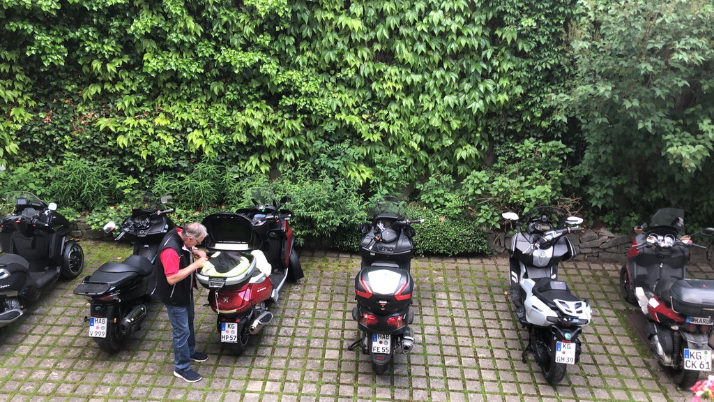 Ab Fuchsstadt zu sechst über Schweinfurt, das Maintal, durch den Norden von Bamberg nach Geisfeld am Beginn der fränkischen Schweiz. Hier stieß unser siebter Teilnehmer dazu.Durch die fränkische Schweiz in die Hersbrucker Schweiz zur Mittagspause in Krottensee bei Neuhaus an der Pegnitz. Danach durch Amberg und Cham zum Hotel in Hohenau zwischen Grafenau und Freyung. Dort hatten wir für die Folgetage einen guten Parkplatz im Hinterhof.