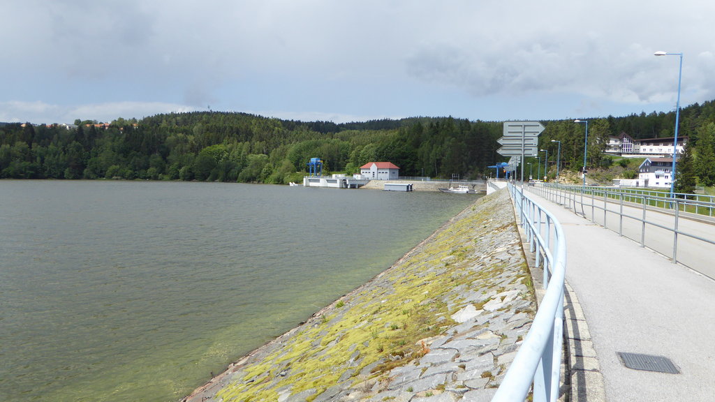 Zuerst ein Stück der Moldau entlang ging es dann quer durch eine schöne Landschaft wieder zurück zum Moldaustausee. An dem entlang zur Staumauer zur nächsten Pause.