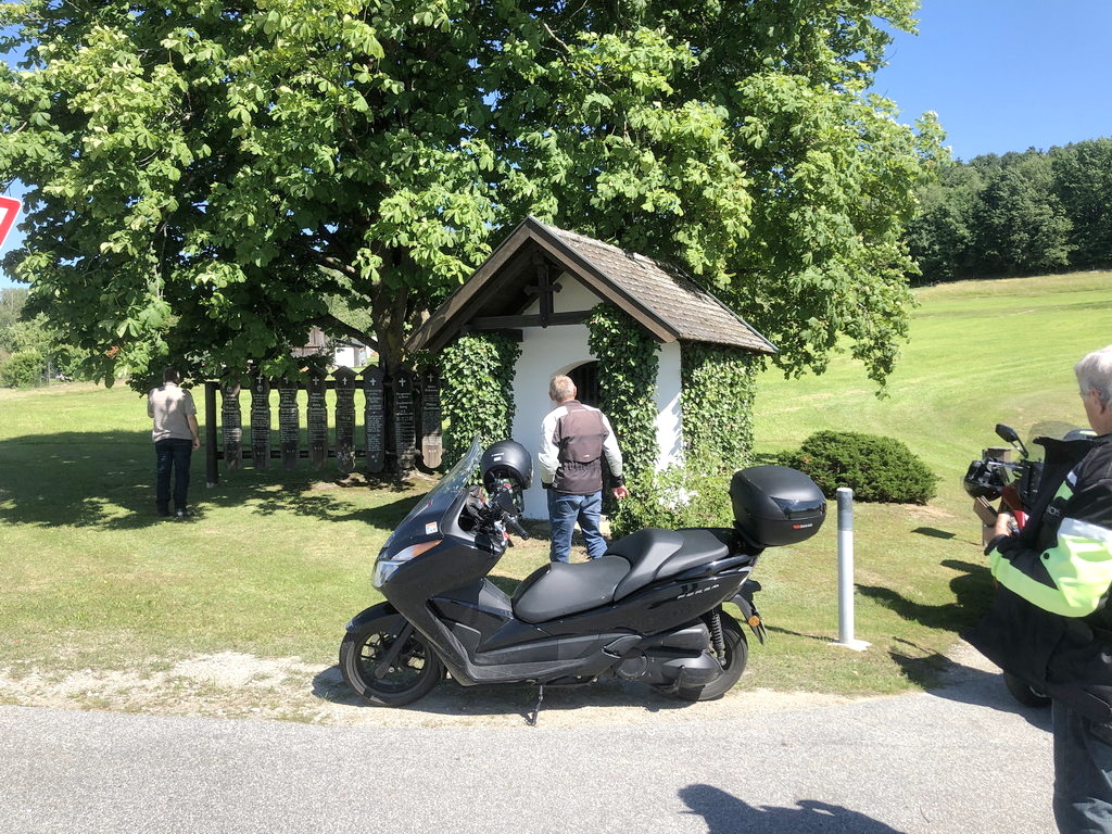 Über Grafenau zuerst durch die Wälder, schmalen Straßen und zahlreichen Kurven in den Süden und dann nach Westen. Zwischendurch eine Rast an einer kleinen Wegkapelle bei Konrading. Interessant dort die zahlreich links neben der Kapelle aufgestellten Totenbretter.
