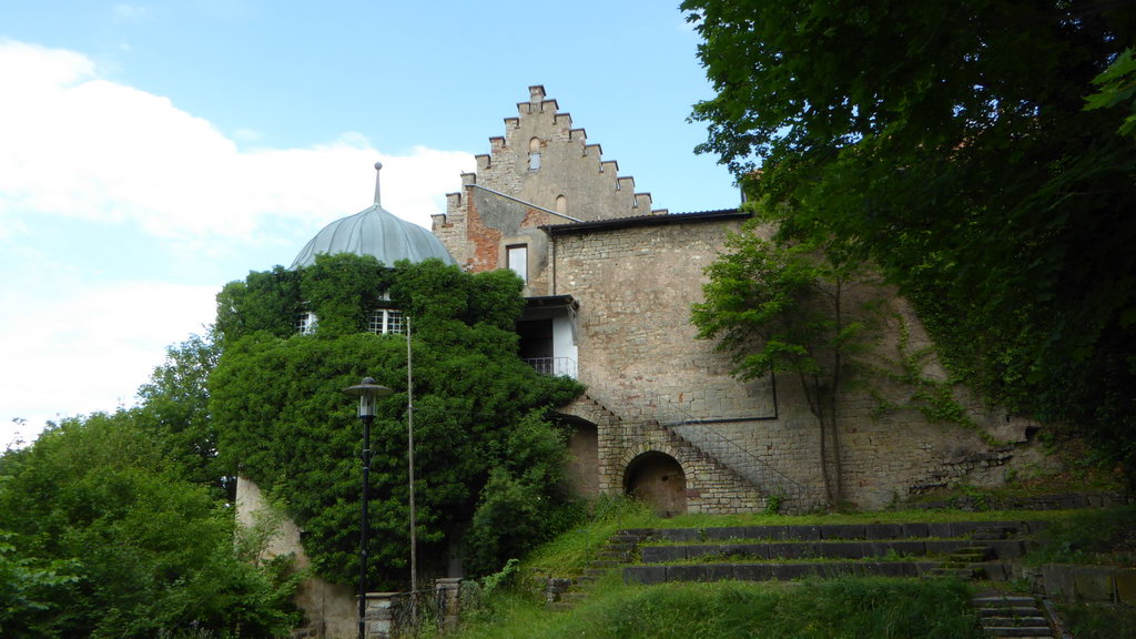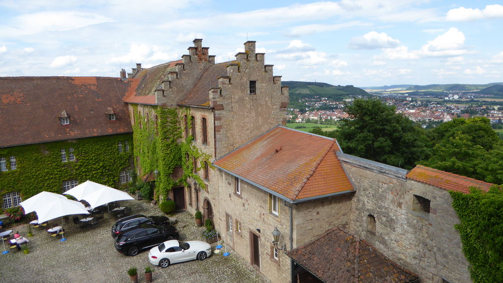 Dort steht weithin sichtbar "Schloß Saaleck". Die Burg wurde erstmals um 1030 erwähnt. Die Fürstäbte von Fulda bauten die Anlage aus und erweiterten sie. Mehrmals ruinös wurde sie immer wieder hergerichtet. Zwischendurch war sie in Privatbesitz ehe 1964 die Stadt Hammelburg die Anlage übernahm.