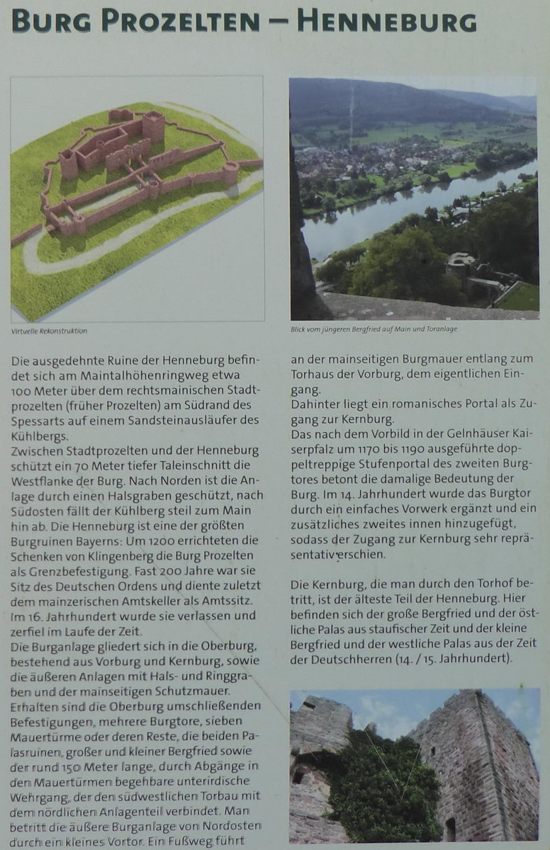 Bei Stadtprozelten wurde die Henneburg erkundet. Eine staufische Höhenburg, deren Ursprung auf das 12. Jahrhundert zurückgeht. Zur Zeit finden dort Renovierungsarbeiten statt. Große Teile der Anlage können trotzdem besichtigt werden.