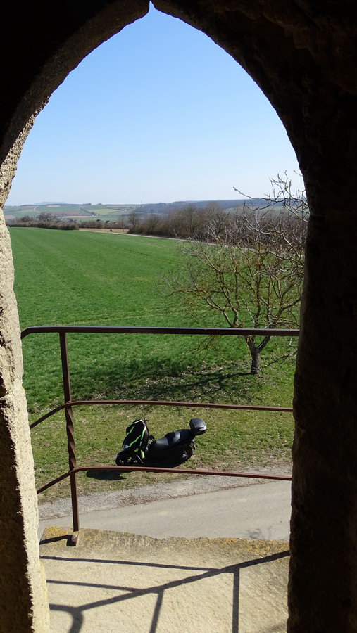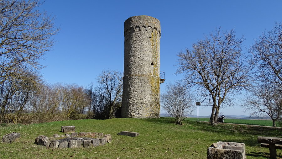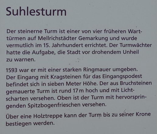 Durch Bad Neustadt in Richtung Mellrichstadt. Wegen Straßenbauarbeiten im Raum Frickenhausen musste ich die Route etwas ändern und gelang trotzdem zum nächsten Wartturm. Dem "Suhlesturm" westlich der Stadt. Es ist einer von vier früheren Warttürmen auf Mellrichstädter Gebiet. Der 17 m hohe Turm kann bis oben bestiegen werden.