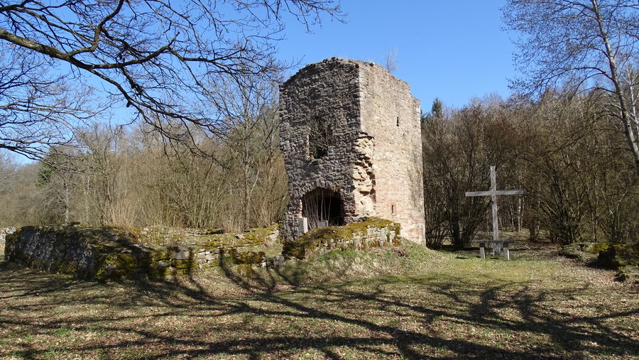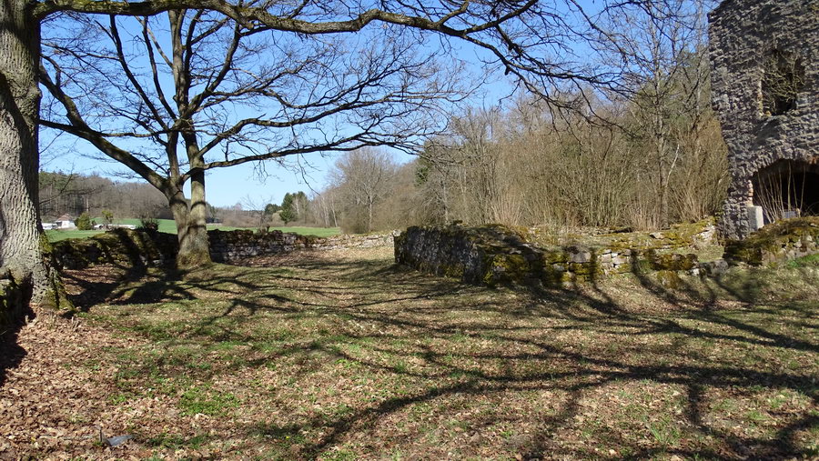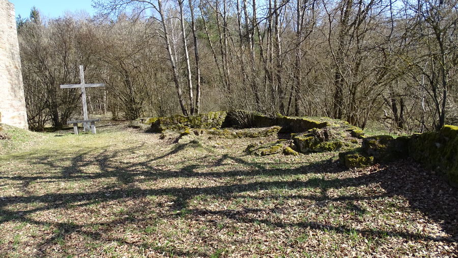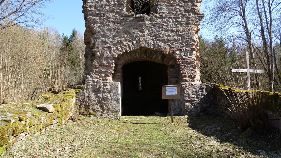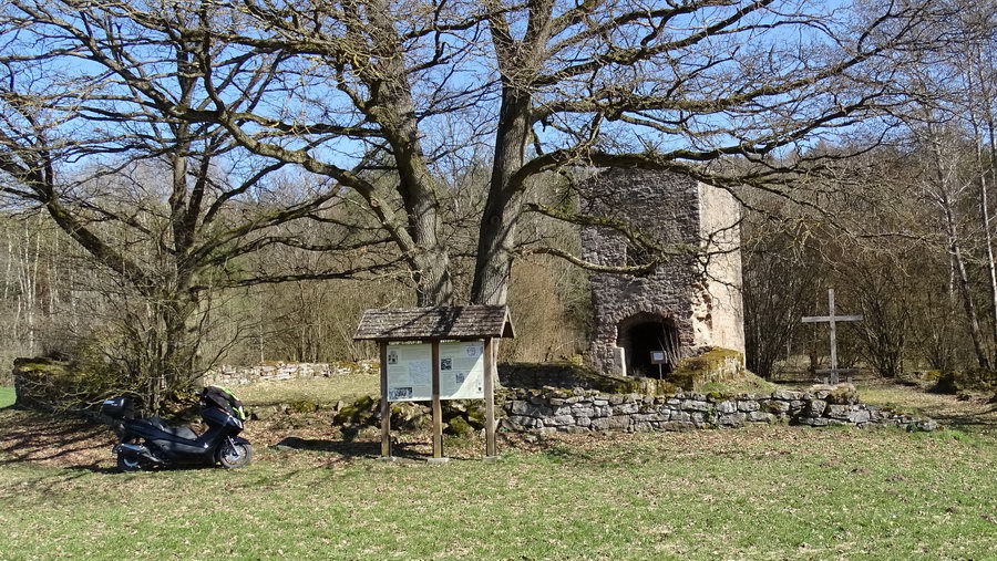 Über Stockheim ging es zum Willmars'er Ortsteil Filke. Dort ist am Waldrand östlich der Ortschaft die Kirchenruine "Mauerschädel". Erbaut um 1000 fiel sie noch im Mittelalter wüst.