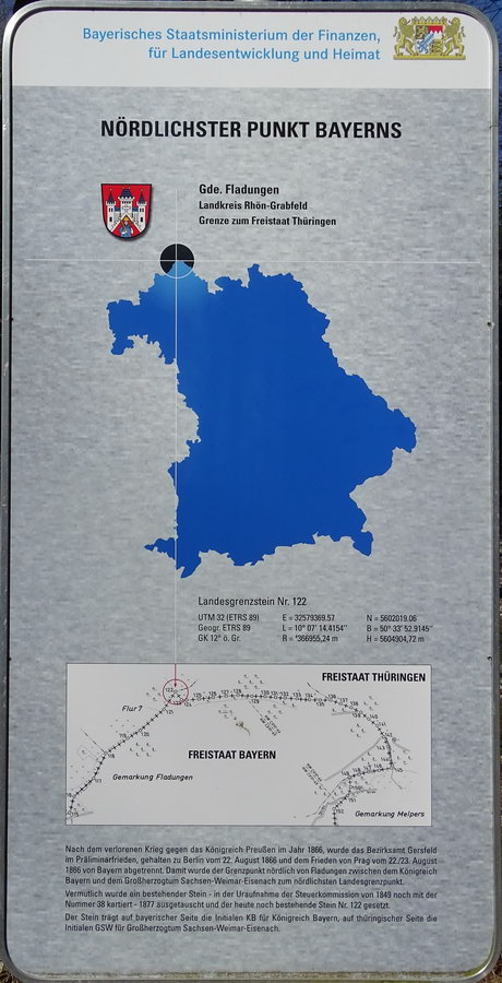Ein kleiner Schlenker über Fladungen nach Thüringen. Kurz nach Melpers geht ein befahrbarer Weg in Richtung Landesgrenze. Als links der Kolonnenweg auftauchte stellte ich den Roller ab und ging die wenigen Meter bis zum nördlichsten Punkt Bayerns. Dort steht der Grenzstein Nr. 122 aus dem Jahr 1877. Auf der einen Seite ist er bezeichnet mit KB für Königreich Bayern und auf der anderen Seite mit GSW für Großherzogtum Sachsen-Weimar-Eisenach.