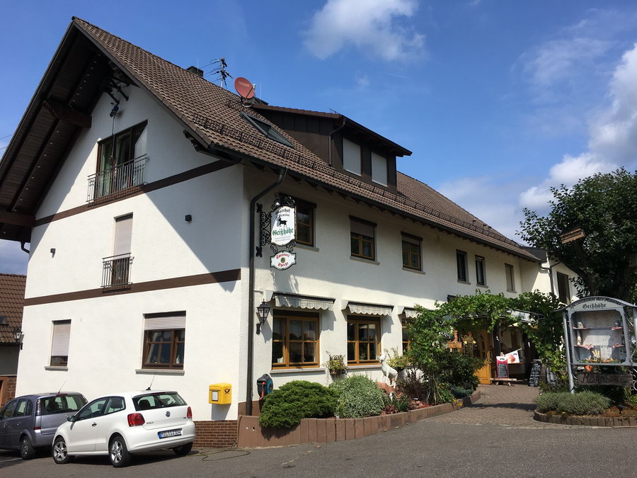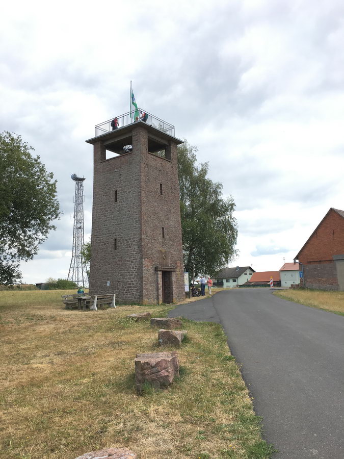 Weiter zur Geishöhe bei Dammbach. Es ist der höchstgelegene und dauerhaft bewohnte Ort im Spesart. Auf dem 521 m hohem Berg gibt es nicht nur eine Gaststätte, sondern auch den Ludwig-Keller-Turm mit einer (bei gutem Wetter) hervorragenden Rundumsicht. Als wir dort waren behinderten Dunst und Wolken die Weitsicht.