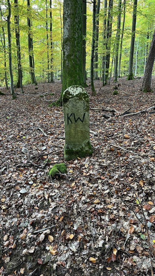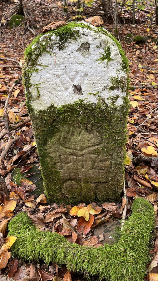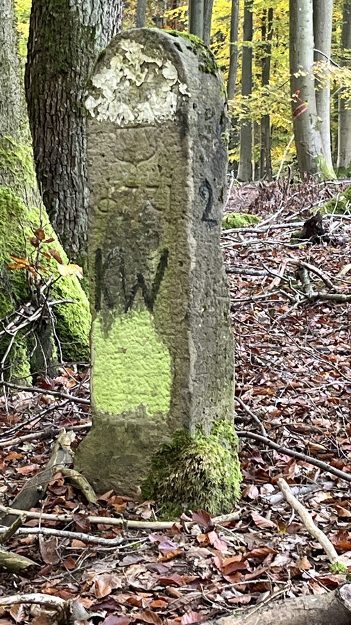 D-6-72-139-86: Großseifertsholz. Grenzsteine zwischen Hochstift Würzburg und Hochstift Fulda, ca. 25 Sandsteinstelen mit würzburgischem und fuldischem Wappen, z.T. bez. 1721, Eckstein am Rimberg beidseitig bez. 1594