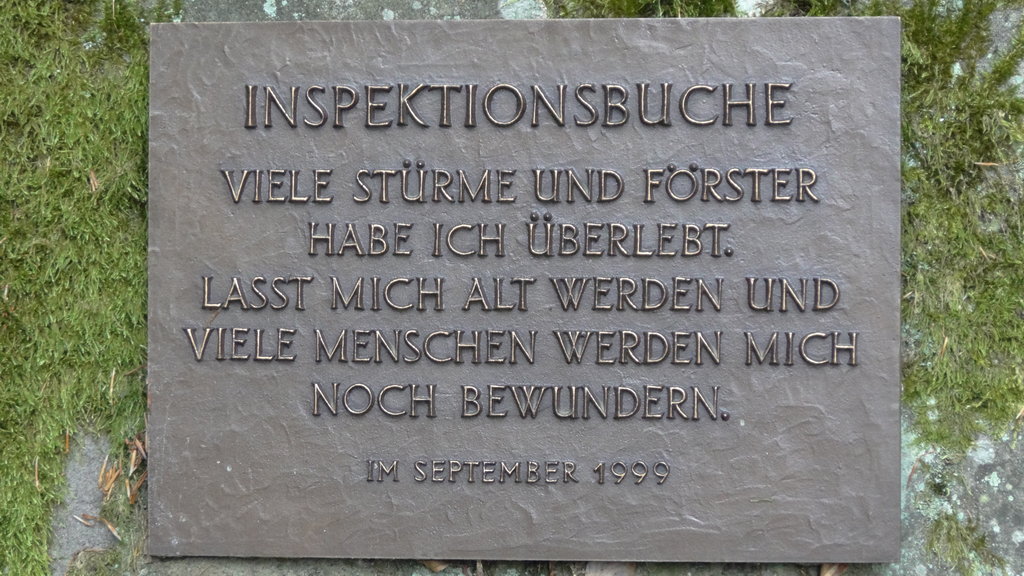 | INSPEKTIONSBUCHE VIELE STÜRME UND FÖRSTER HABE ICH ÜBERLEBT. LASST MICH ALT WERDEN UND VIELE MENSCHEN WERDEN MICH NOCH BEWUNDERN. IM SEPTEMBER 1999 |
