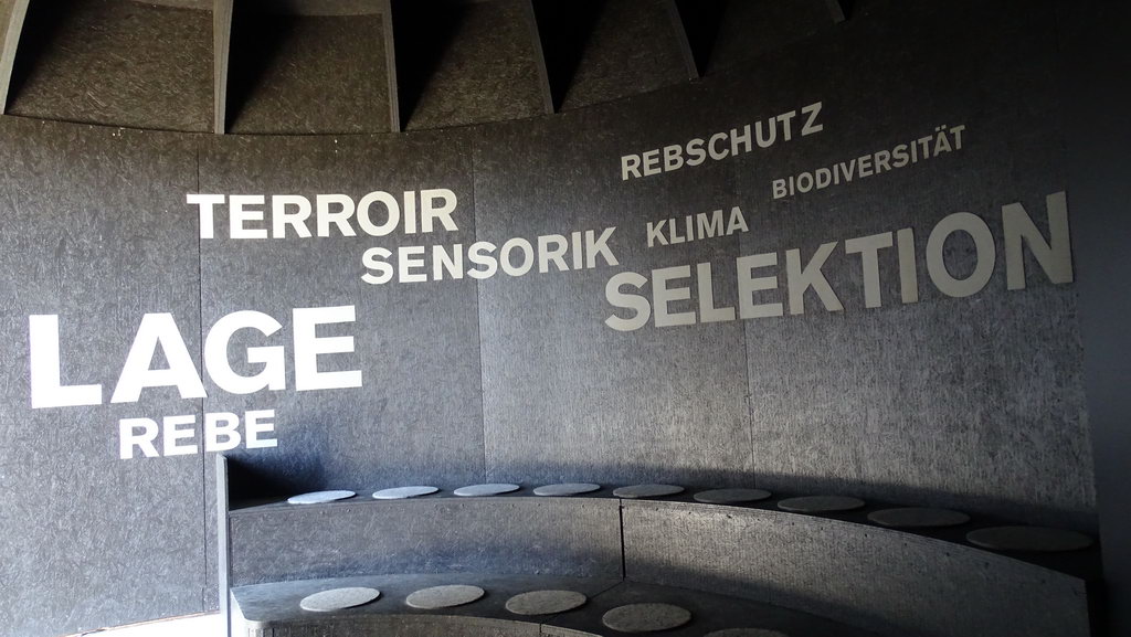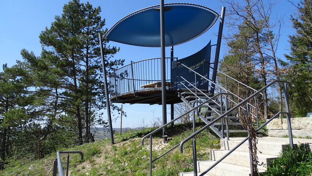 Interessant die Bauform des Gebäudes. Im Innern rundherum Sitzplätze mit Aussicht auf die Weinberge und Rimpar.