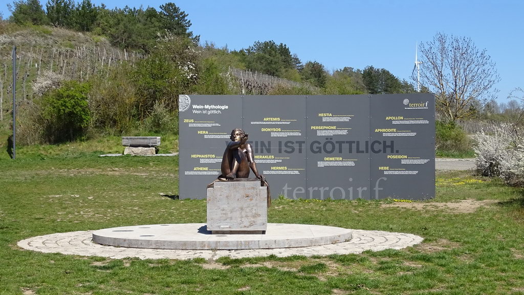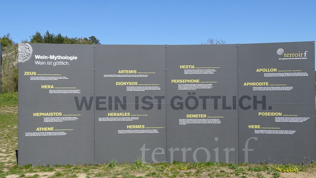 Weiter durch die Weinberge (keine gesperrten Wege) hinunter zur B 27 und nach Thüngersheim. Nach dem Ortseingang über die Hönigsbergstraße hinauf zu den Weinbergen und zum ausgeschilderten terrior-f Ort Thüngersheimer Johannisberg. Er steht für "Wein und Mythologie"