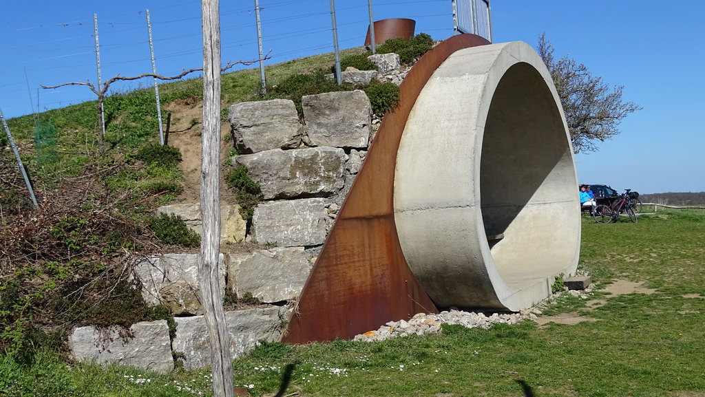 Wieder zurück durch Thüngersheim zur Straße Scharlachsgrund. Hier hoch und in den Weinbergen zu einem "Kinosaal". Leider hing dort ein Schild, dass er zur Zeit außer Betrieb ist. Es lohnt sich einen Gang um den Rundbau zu machen um zu sehen, wie viele Weinsorten es doch gibt. Bestimmt interessant in einigen Jahren, wenn die Weinstöcke Reben tragen und man die Vielfalt der Trauben anschauen kann.
