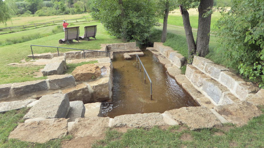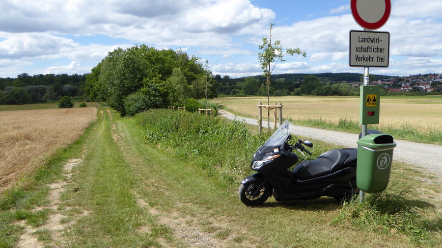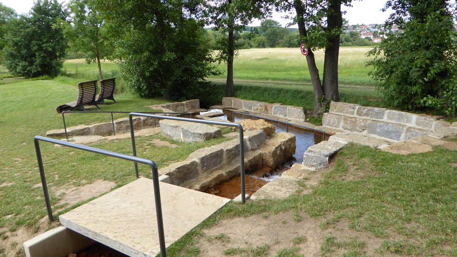 Über Bergrheinfeld an der A 70 entlang nach Wonfurt. Dort besuchte ich die "Eisenquelle". Benannt, weil dort in einem Quelltrichter Eisenhydroxidhaltiges Wasser austritt. Wenige Meter danach legte die Gemeinde Wonfurt eine schöne Kneippanlage an.