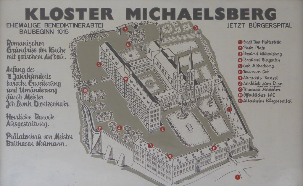 Gegründet 1015 als Benediktinerkloster St. Michael. Nach der Säkularisation kam es in den Besitz der Stadt Bamberg. Heute ist dort u.a. das Bürgerspital.