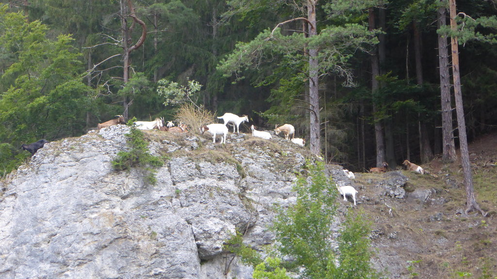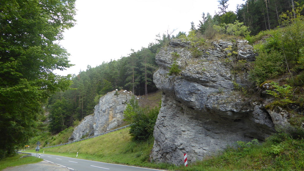 Zurück nach Weismain. Dort über das Obere Tor aus der Stadt heraus und am Weismain entlang in Richtung Kleinziegenfeld. Ob der Name des Dorfes etwas mit den Ziegen, die ich kurz vor dem Ort auf einem Felsen sah, zu tun hat? Bekannt ist der Ort wegen des Radfahrers auf einem Felsen und der Weismainquelle im Ort.