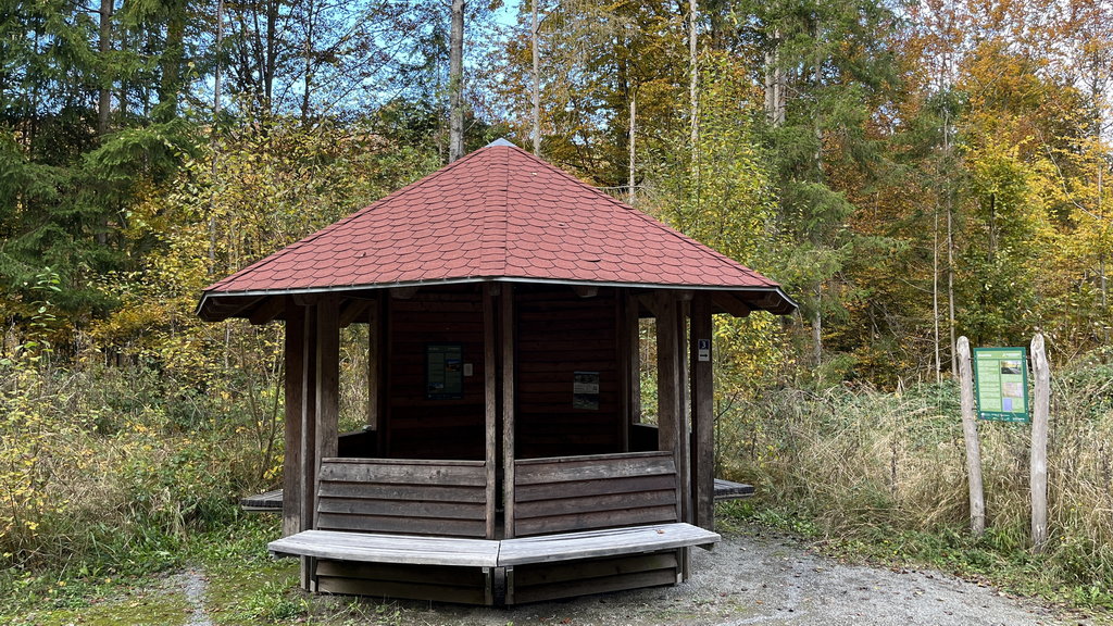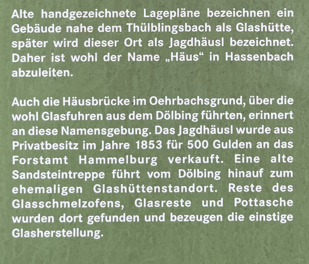 Am Pavillon wird die Geschichte der in der Nähe befindlichen Glashütte erklärt. Diese ist dort in alten Karten mit "Jagdhäusel" bezeichnet.