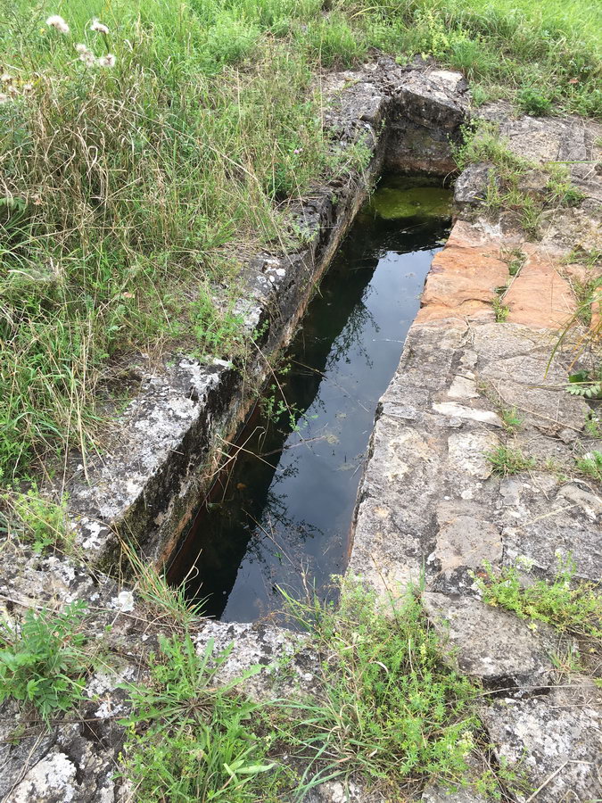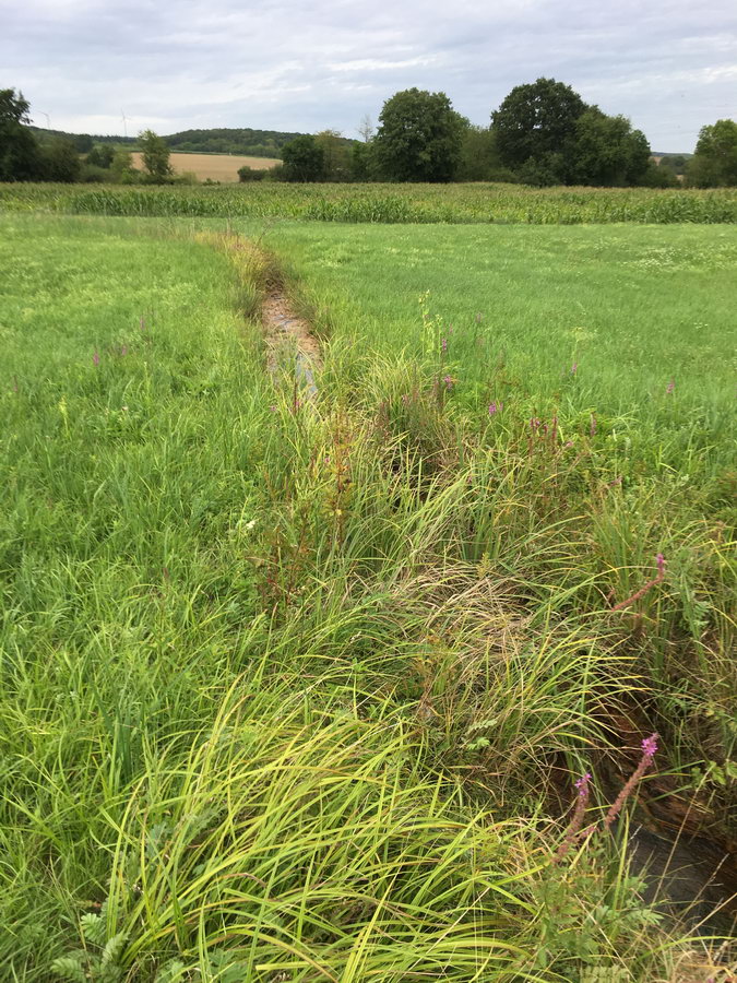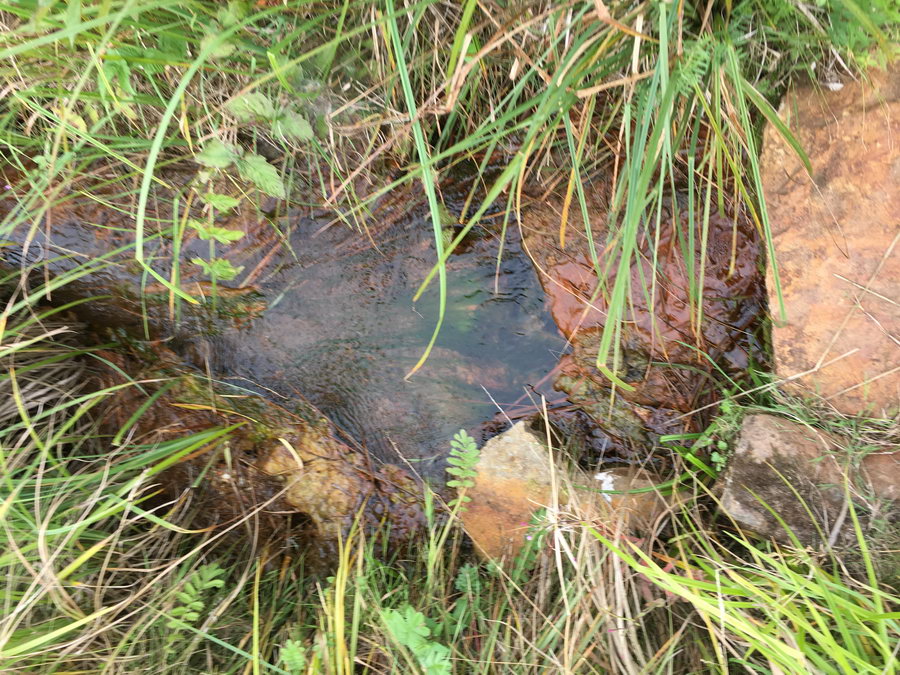 Inmitten der Wiese ist eine "Mineralquelle" gefasst, die im Normalfall eine Schüttung von 10 l/s hat. Am deutlich rot gefärbten Grund und an den Pflanzen zeigen sich Eisenhydroxidausfällungen. Außerdem hat das Wasser eine deutliche Kalziumsulfatbetonung. Getrunken habe ich das Wasser nicht, da sich Frösche darin recht wohl gefühlt hatten.